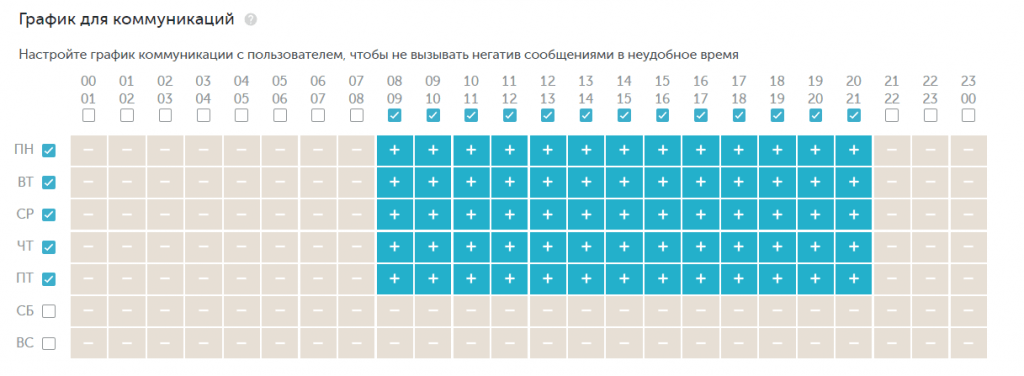 Также в сценариях вы можете указать график коммуникаций. Это нужно, чтобы избежать отправки сообщений в неудобное время. Например, если по графику разрешены коммуникации с 08:00 до 18:00, а триггер выполнен в 21:32, то действие будет отправлено в ближайшее рабочее время, то есть в 08:00.