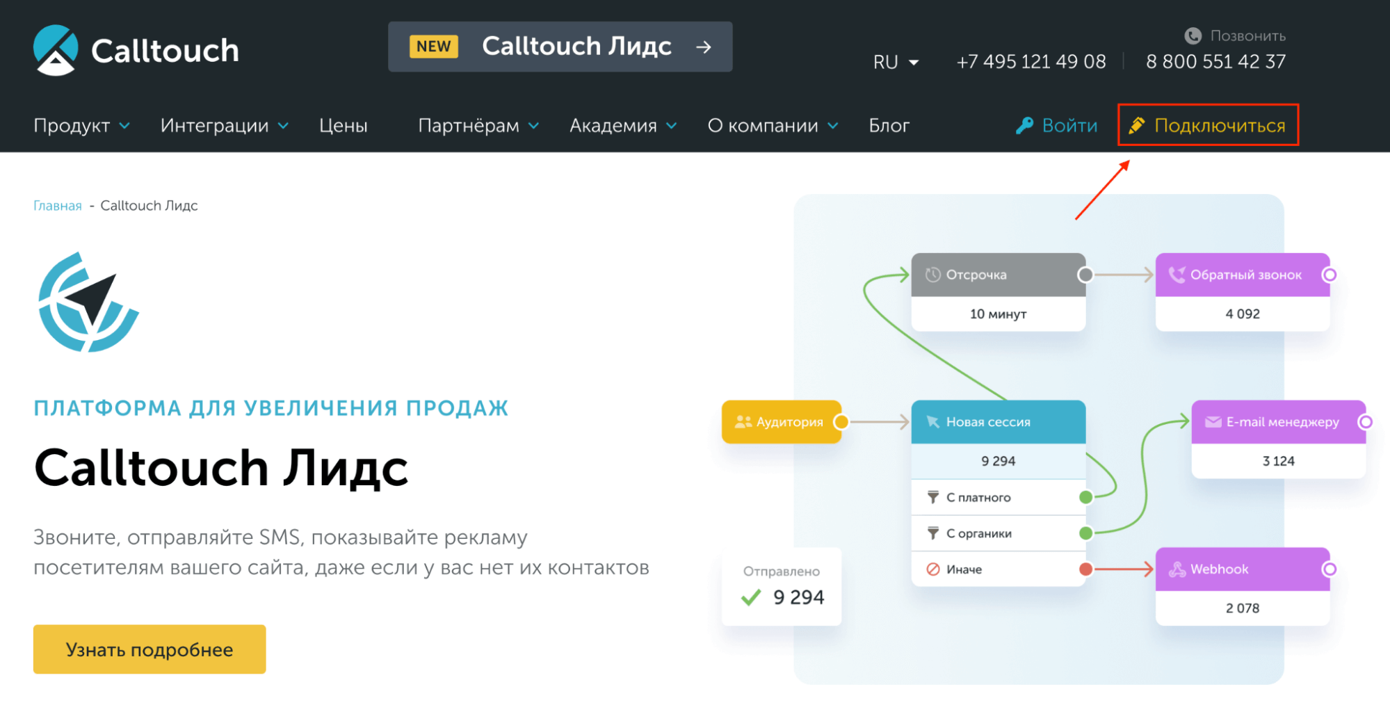 Заходим на сайт Calltouch Лидс и отправляем заявку на подключение, для этого жмём «Подключиться» в правом верхнем углу.