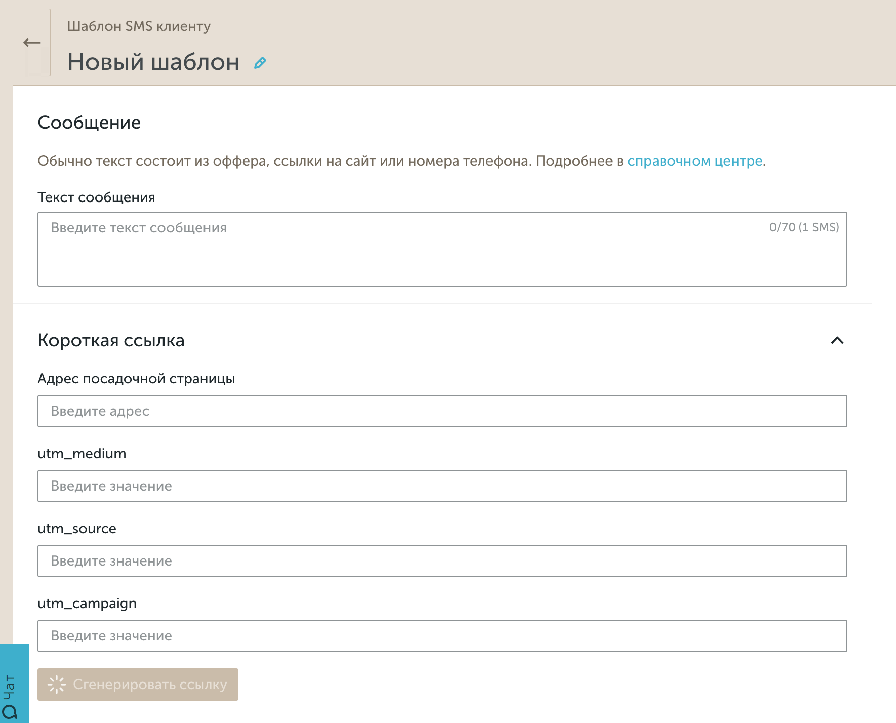 Под полем для текста вы можете сгенерировать короткую ссылку, чтобы текст ссылки не занимал слишком много места в сообщение, так как СМС ограничено количеством символов. После ввода всех параметров ссылки, нажмите на кнопку «Сгенерировать ссылку» и вставьте полученный URL в текст сообщения.