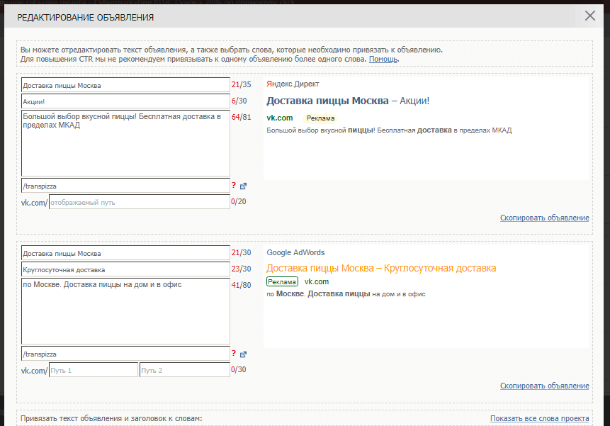 После нажатия откроется окно, в котором можно отредактировать текст объявления и выбрать ключевое слово, к которому данное объявление будет привязано. Лучше всего работать по схеме «один ключ – одно объявление». Так ваше объявление будет более релевантным запросу, а его CTR будет выше:
