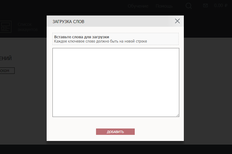 Функция «Добавить списком» открывает новое окно, в котором можно добавить слова вручную. Каждую фразу нужно писать с новой строки:
