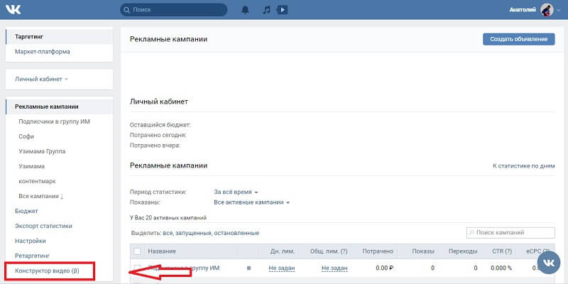 Шаг 1. Чтобы сделать ролик в конструкторе видео, заходим в рекламный кабинет ВКонтакте, находим новую вкладку «Конструктор видео» и кликаем на неё (функция пока недоступна в партнёрских рекламных кабинетах).
