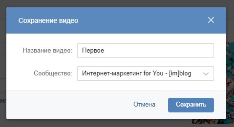 При сохранение видео, созданного в конструкторе, нужно придумать ему название и указать к какому сообществу оно относится (появится в разделе видеозаписи).