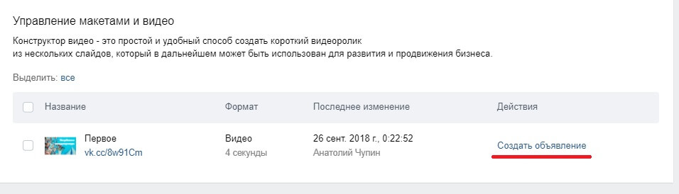 Шаг 10. Запуск видео рекламы. После этого видео будет видео будет некоторое время в обработке и получит соответствующий, статус, который затем сменится на «Создать объявлений».