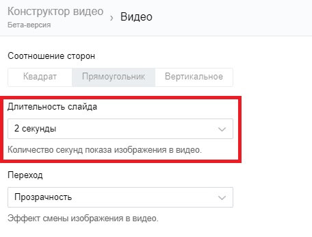Шаг 4. Длительность слайда. Минимальная продолжительность нахождения одного слайда на экране 2 секунды, максимальная — 20. Можно добавить не более 10 слайдов.
