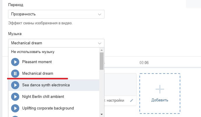 Шаг 6. Музыка. На данный момент можно выбрать музыкальное сопровождение для видео из 20 стандартных аудиодорожек, любезно предоставленными социальной сетью ВКонтакте.