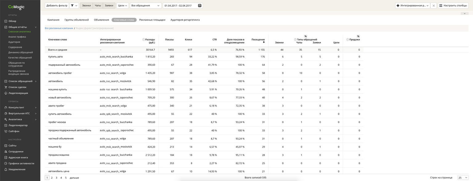 Пример отчета по ключевым фразам CoMagic