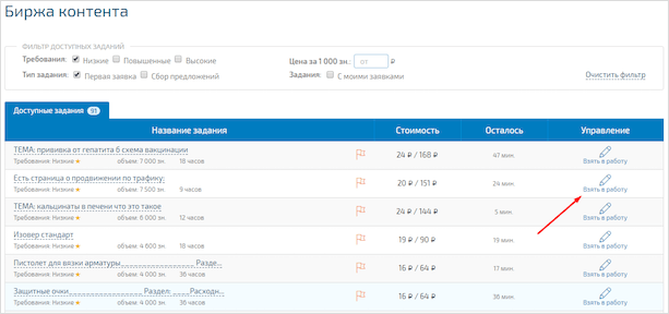 Вверху страницы находится раздел “Биржа”. Переходим туда, чтобы выбрать первый заказ. Перед нами открывается список доступных заданий.