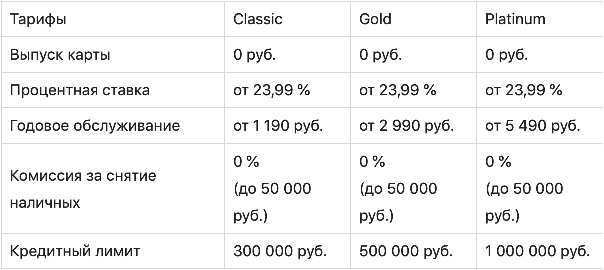 Как видите, карточки отличаются друг от друга только кредитным лимитом и стоимостью годового обслуживания.