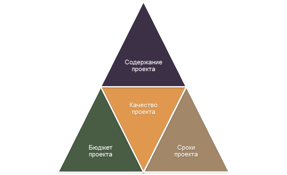 Классический проектный треугольник состоит из трёх ограничивающих проект факторов: это содержание, время и бюджет. Каждый из них влияет на качество продукта и друг на друга.