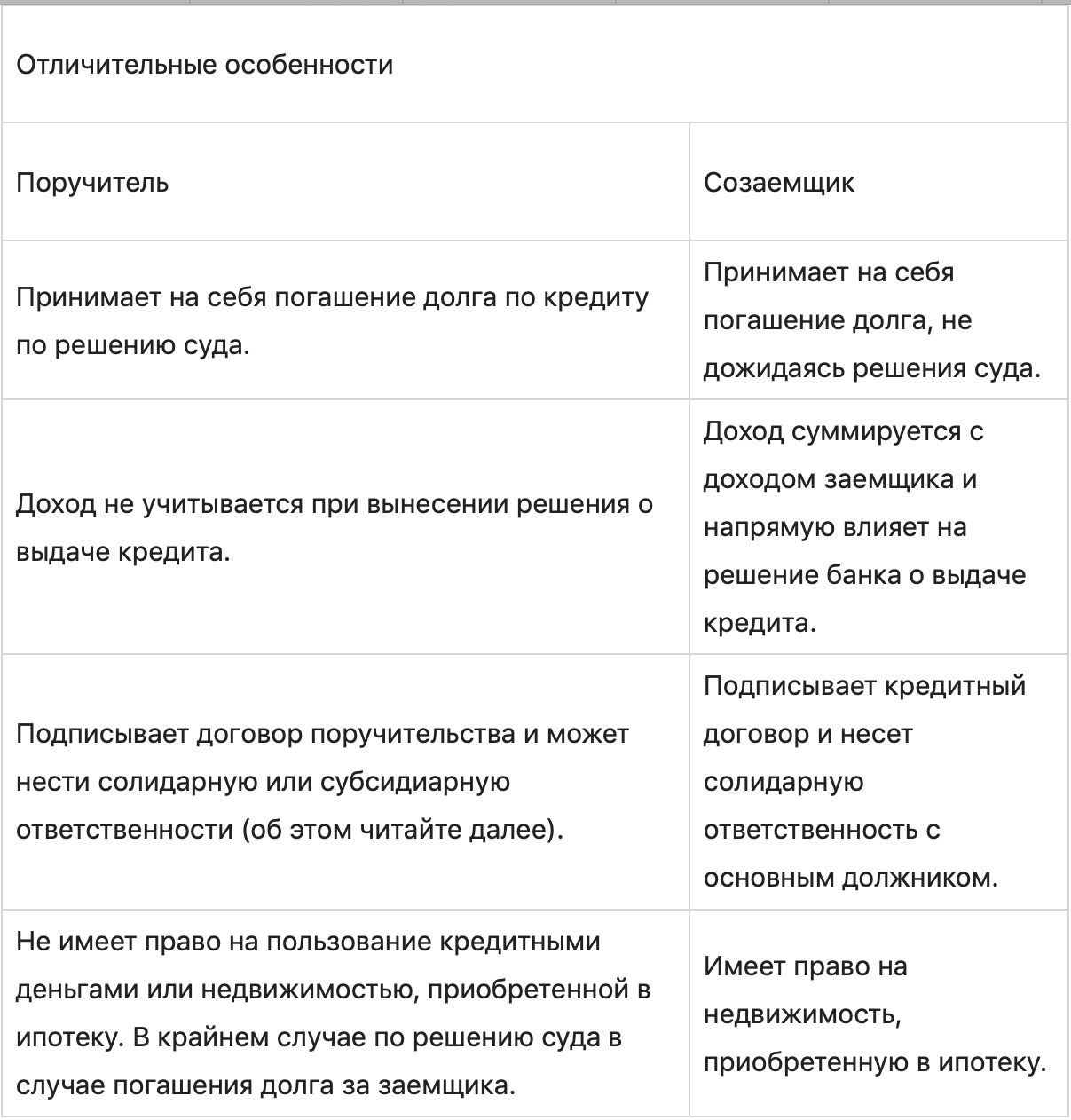 Поручитель таким образом поручается за заемщика, но не обладает его правами, например, на оформление квартиры в собственность или владение машиной. Созаемщик получает кредит вместе с заемщиком и имеет одинаковые с ним права.