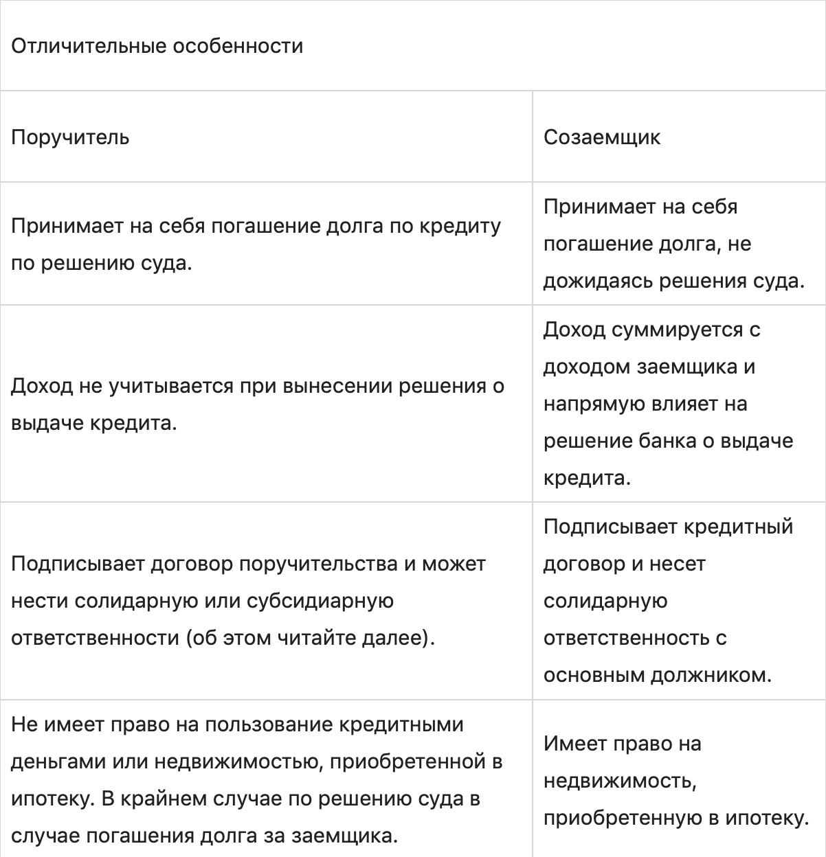 Хотим обратить внимание, что анализ кредитных программ в некоторых банках выявил такую особенность – стираются различия между поручителем и созаемщиком. Например, в ВТБ речь идет о поручителях, но по требованиям это созаемщики, потому что учитываются их доходы в совокупном доходе для получения кредита.