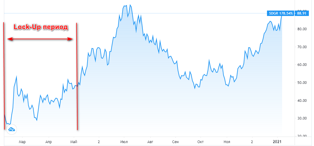 Положительных примеров больше. Например, компания из отрасли программного обеспечения и программирования Schrodinger (SDGR) вышла на IPO в феврале 2020 г. Цена размещения – 17 $. Через 3 месяца доходность составила 222,49 %.