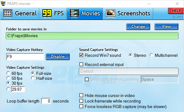 Утилита создана для съёмки с экрана и подсчёта частоты смены кадров (FPS). Сделать запись своего рабочего стола не выйдет, т. к. Fraps заточен на захват из игр. В демо видеозапись длится максимум 30 секунд, и на неё ставится водяной знак, так что необходимо приобретать полную версию. Пишет в AVI.