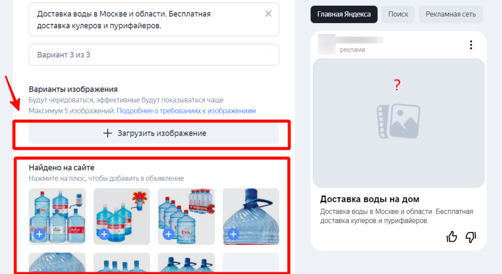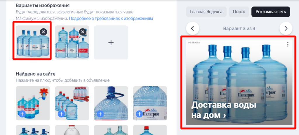 Здесь особое значение имеет не текст, а фото. Важно выбрать такое изображение, которое будет смотреться аккуратно и эстетично на всех вариантах объявлений. Варианты можно прокликать справа под надписью «Рекламная сеть».
