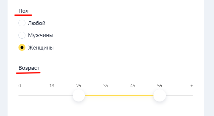 Далее определяем, люди какого пола и возраста будут видеть ваши объявления. Эту информацию желательно брать не «из головы», а из статистики по продажам (кто чаще всего делает заказ) или из счетчика, установленного на сайте.