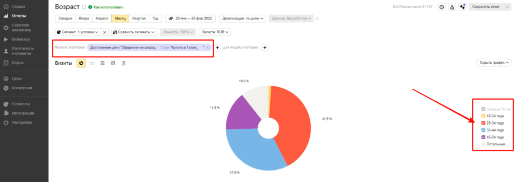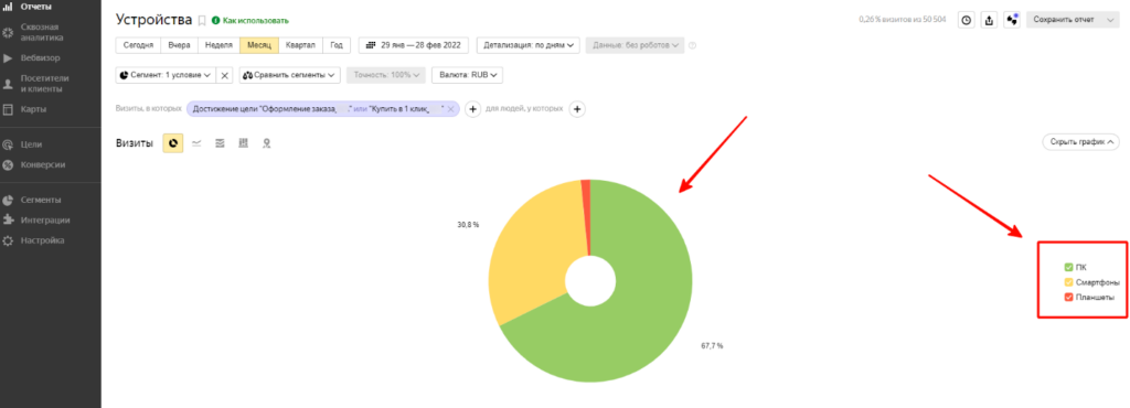 При просмотре этой информации в счетчиках крайне важно выставить фильтр или сегмент по тем визитам, в процессе которых были совершены целевые действия (заказы через корзину, звонки, покупки в 1 клик и т. д.). Если этого не сделать, то большой пользы от полученной информации не будет, так как это будут данные обо всех, а не только о целевых посетителях.
