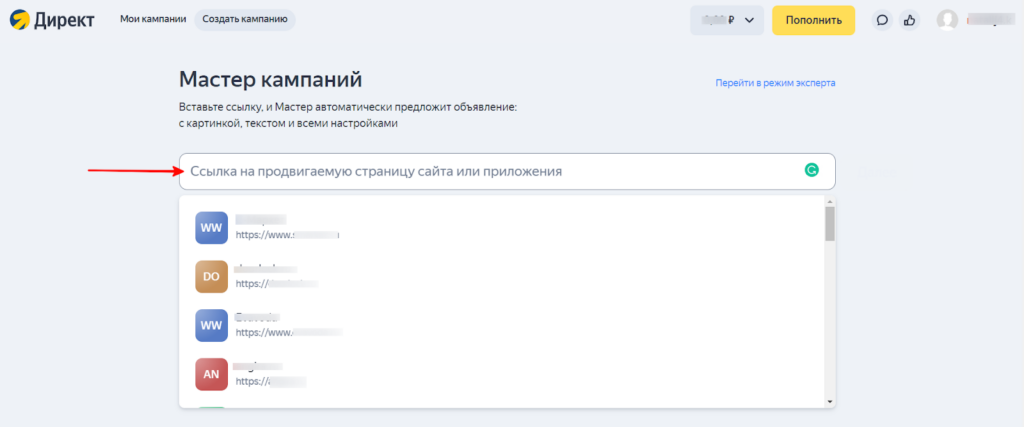 - Если возможностей инструмента не хватит, можно в любой момент переключиться в стандартный кабинет Директа по клику на кнопку «Перейти в режим эксперта».