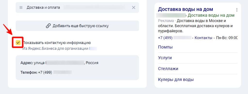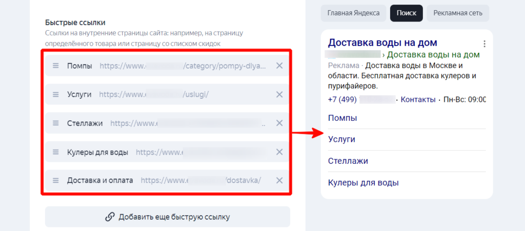 Например, если наше объявление касается воды, то ссылку на воду лучше убрать, а оставить сопутствующие товары (помпы, стеллажи, кулеры), услуги и информацию о доставке и оплате.
