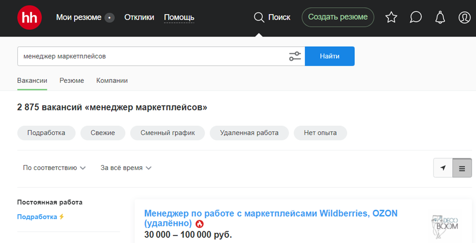 Основной источник предложений о работе ㅡ интернет. Рассмотрим самые популярные онлайн площадки, которые будут полезны менеджеру маркетплейсов.