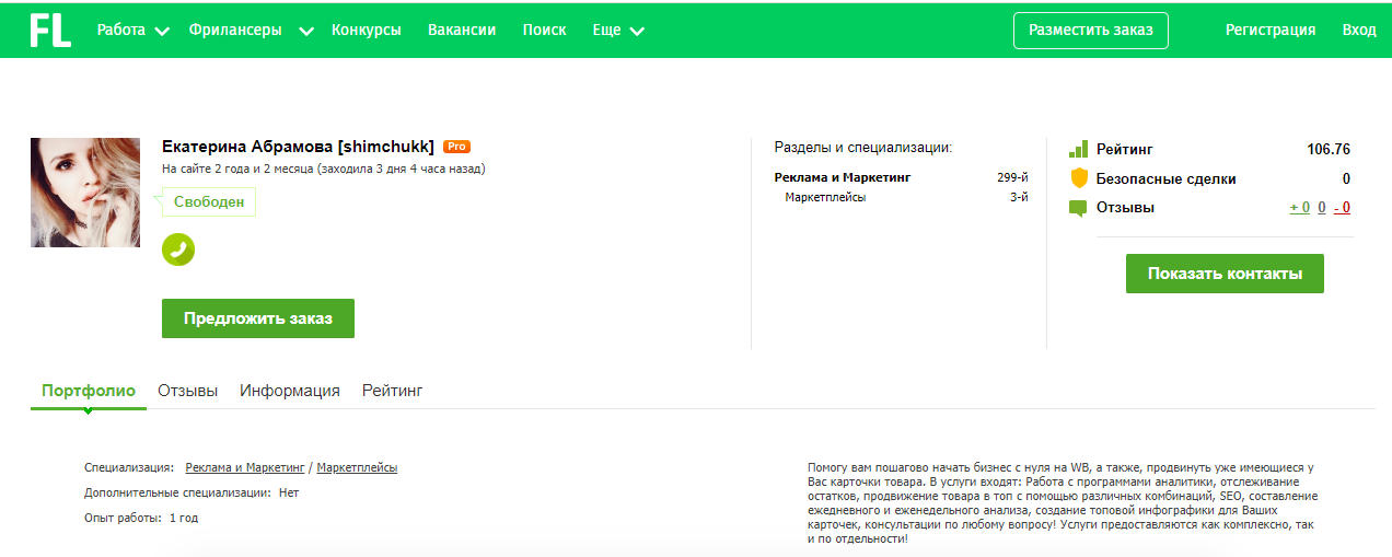 десь соискатель сам может разместить резюме, описать опыт работы и предложить список услуг. Здесь же публикуются отзывы о работе специалиста от работодателей, портфолио и ожидания по зарплате.