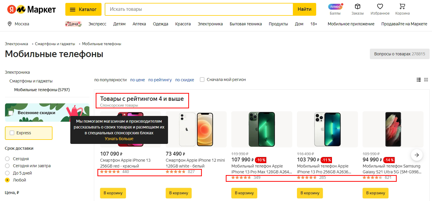 Все платформы при формировании поисковой выдачи отдают предпочтение товарам с большим количеством отзывов и высоким рейтингом. А на Яндекс.Маркете их можно дополнительно платно продвигать в специальном спонсорском блоке на самом верху страницы:
