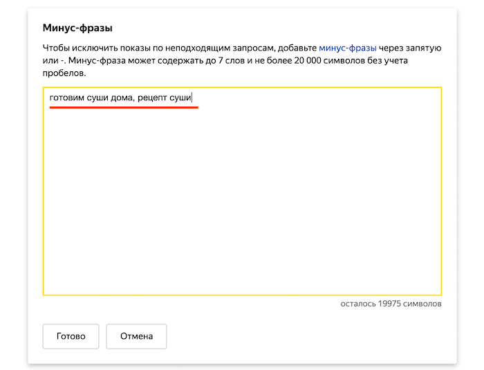 Например, вы добавили ключевую фразу [суши] и минус-фразу [готовим дома], в таком случае по запросу [как сделать суши дома] — объявления будут показаны.