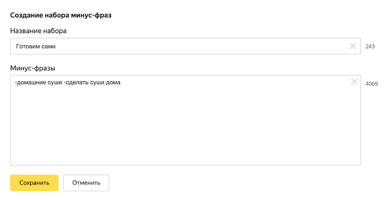 Затем введите название набора и укажите минус-фразы через запятую или дефис. Максимально допустимое количество символов — 4096 без учета пробелов.