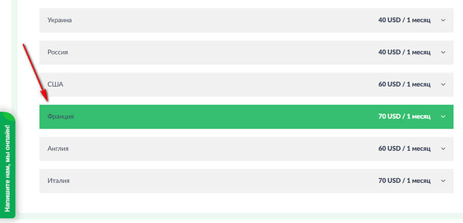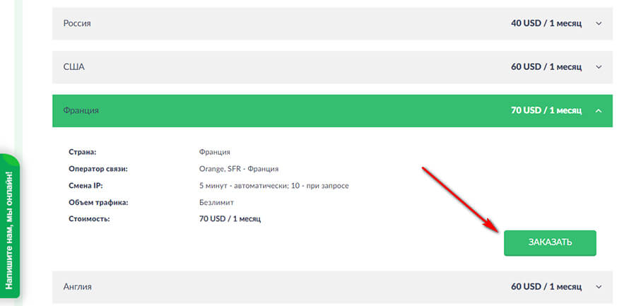 Чтобы купить приватные мобильные прокси нужно выбрать в списке страну и нажать на нее. Страну выбираем исходя из из данных, которые на нужны. Например, если живете в РФ и хотите работать с Фейсбуком, как пользователь из Франции — выбираете соответствующий пакет.