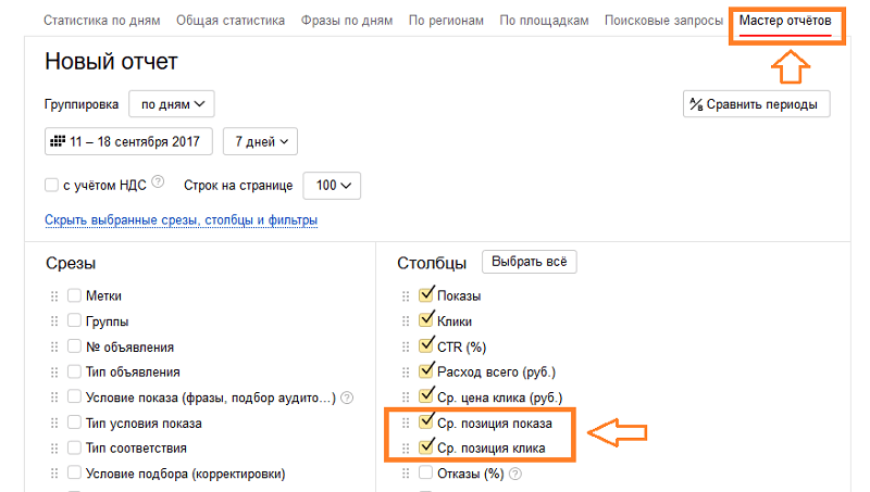 С третьим пунктом Яндекс справляется и сам. Для этого нужно зайти в статистику по компаниям, перейти в Мастер отчётов и для формирования отчёта отметить Средняя позиция показа и средняя позиция клика.