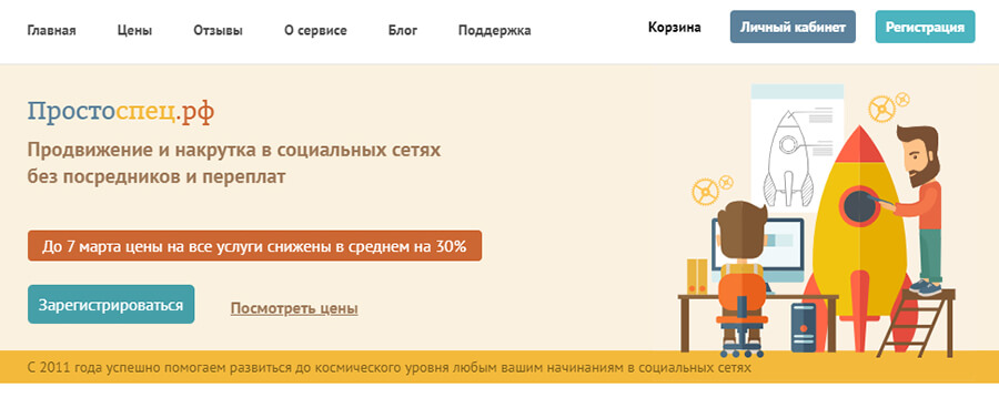 Простоспец — сайт накруток в соцсетях и привлечения трафика на сайт. Работает с 2011 года и считается надежным. Работает с 20+ площадками. Много способов оплаты.