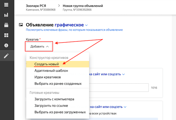 Шаг 1. При создании или редактировании графического объявления в блоке Креативы нажмите «Добавить — Создать новый».