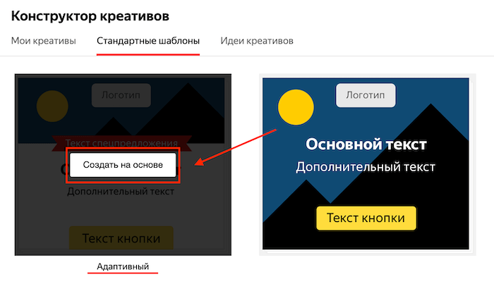 Откроется окно конструктора креативов. Наводим на самый первый шаблон, который подписан «Адаптивный» и кликаем «Создать на основе».