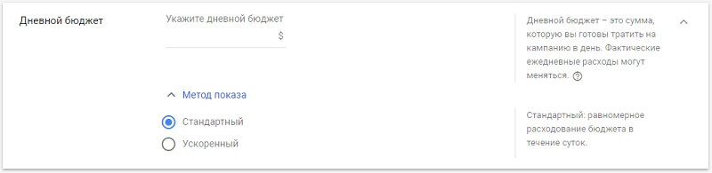 Дневной бюджет и метод показа. Установите дневной лимит затрат на рекламу, метод показа не меняйте, оставив стандартный — объявления будут показываться равномерно в течение суток.