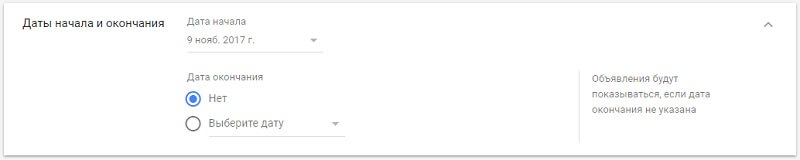 Дата начала и окончания кампании. В качестве начала оставьте сегодняшний день, что показ начался сразу после прохождения модерации. Дату окончания можно не устанавливать — кампания остановится когда закончится бюджет или когда вы остановите её вручную.