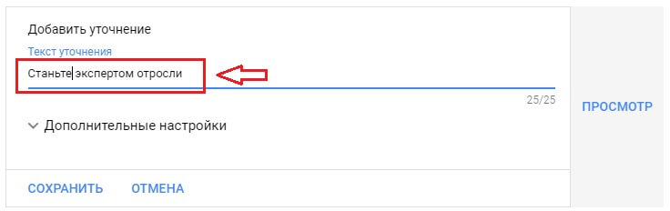 Уточнения. Продолжаем улучшать качество объявлений и добавляем уточнения. Одно уточнение не более 25 символов. Здесь стоит описывать дополнительные преимущества своего товара или услуги. Дополнительные настройки оставляем по умолчанию.