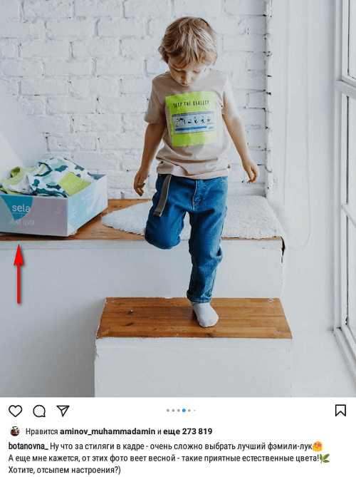 Бренды стали чаще обращаться к блогерам и создавать с ними коллаборации. Пример — блогер @botanovna_ выкладывает фотогалерею, где подбирает для сына новый образ, но если присмотреться на заднем плане одной из фотографий видна коробка SELA, а из текста поста следует, что это вообще розыгрыш одежды SELA.