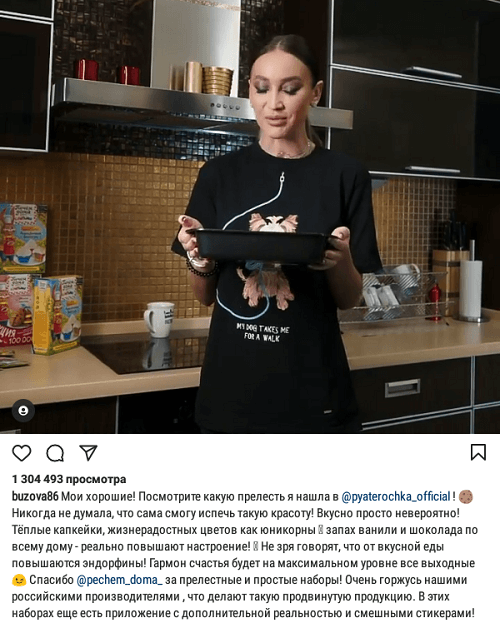Пример — рекламный пост Бузовой про набор для приготовления капкейков дома из Пятерочки. «Капкейки жизнерадостных цветов, запах шоколада по всему дому, гормон счастья будет на максимальном уровне все выходные» — вас тоже переполняют столь яркие эмоции, когда вы готовите завтрак?