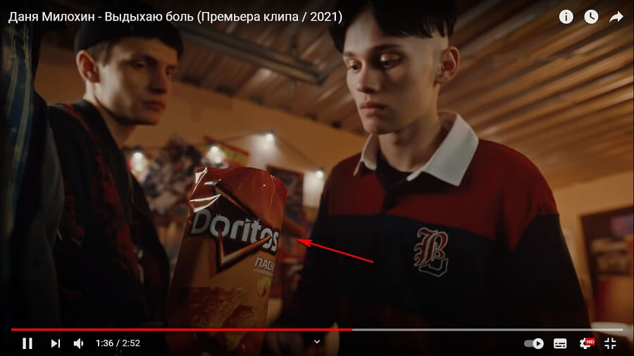 - продакт плейсмент в фильмах, клипах, компьютерных играх, например, чипсы Доритос в клипе Милохина «Выдыхаю боль»;
