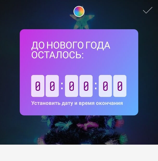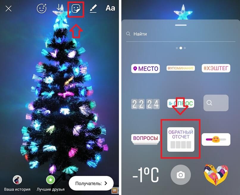 Затем, в верхней части экрана, тапаем иконку наклеек. Откроется окно с выбором различных стикеров: геолокация, хэштег и другие. Среди них находим стикер обратного отсчёта и кликаем на него. Он добавится в нашу Историю.