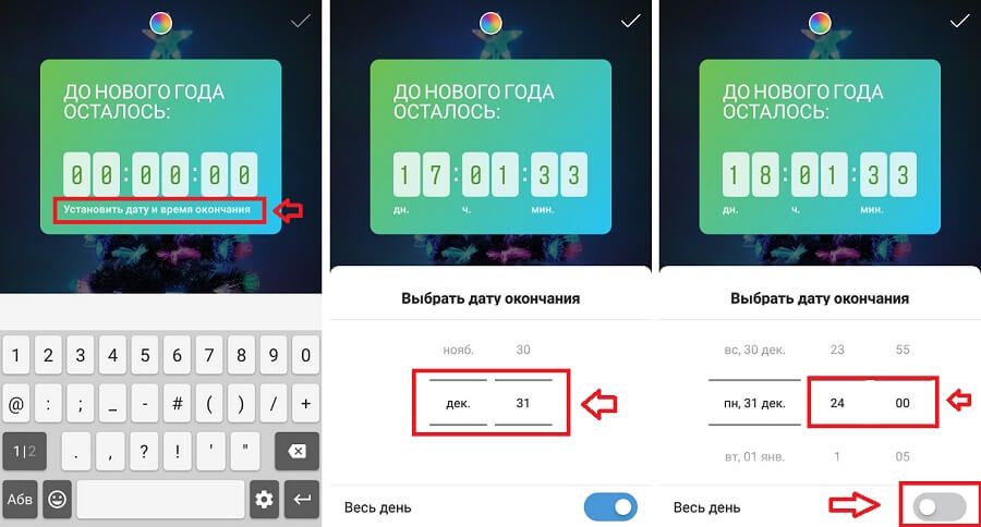 Устанавливаем дату и время окончания. Нажимаем на соответствующую надпись внизу стикера. Выбираем день, до которого будет производится отсчёт. Мы выбрали 31 декабря 2018. Осталось установить время. Для этого внизу, ставим переключатель напротив поля «Весь день» в положение ВЫКЛ и указываем время. Мы поставили до 24.00, то есть до 12 часов ночи.