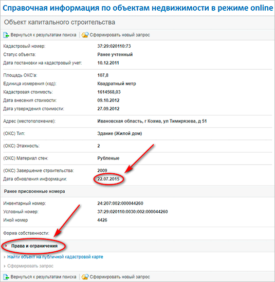 Этот способ бесплатный и очень быстрый. Но есть одно большое НО. Информация показывается в усеченном варианте и, самое главное, устаревшая. Настораживает тот момент, что дата обновления на скрине 22.07.2015 года при запросе в январе 2019 года. Где гарантия, что по покупаемой квартире вы получите достоверную и свежую информацию?