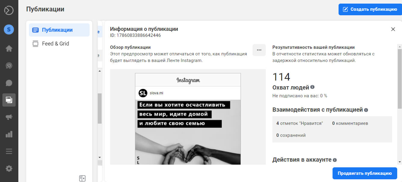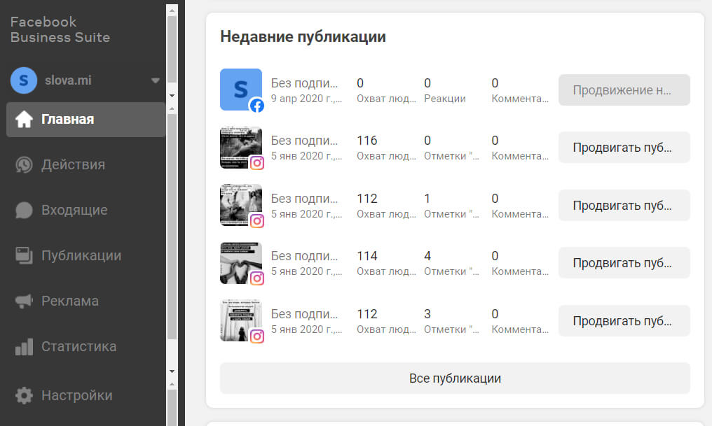 Также на главной странице виден список всех публикаций с информацией о количестве охватов, отметок/лайков и комментариев. Публикации Фейсбук и Инстаграм отображаются своими значками, так что запутаться невозможно. Тут же можно запустить продвижение публикаций, не заходя при этом отдельно в Инстаграм и Фейсбук.