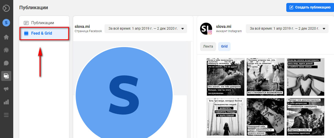 Если нажать на способ просмотра «Feed & Grid» — контент отобразится не списком, а в виде двух параллельных лент Фейсбук и Инстаграм. В окне Инстаграма можно также настроить отображение контента в виде плитки.