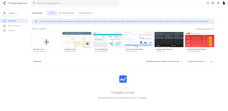 Пройдя авторизацию, мы оказываемся на общей вкладке – по дизайну она очень сильно напоминает Гугл Документы. С левой стороны находится меню, позволяющее передвигаться по архиву отчетов, над ним – кнопка для создания отчетов и добавления источников данных. В основном массиве по умолчанию располагаются сами визуализации, выше – горизонтальное меню.