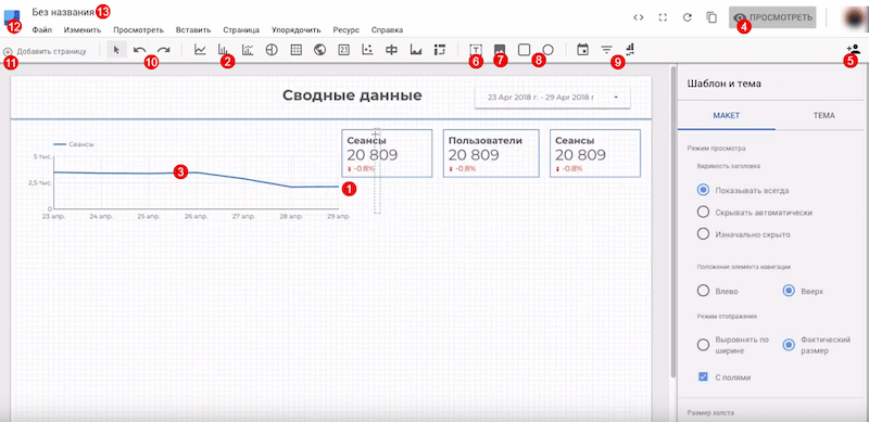 После этого вы попадаете в интерфейс для создания отчетов, потому предлагаем более детально остановиться на нем: