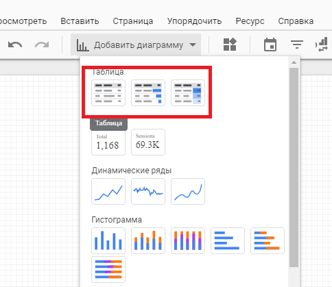 Кликаем «Добавить диаграмму» и выбираем нужный формат таблицы.
