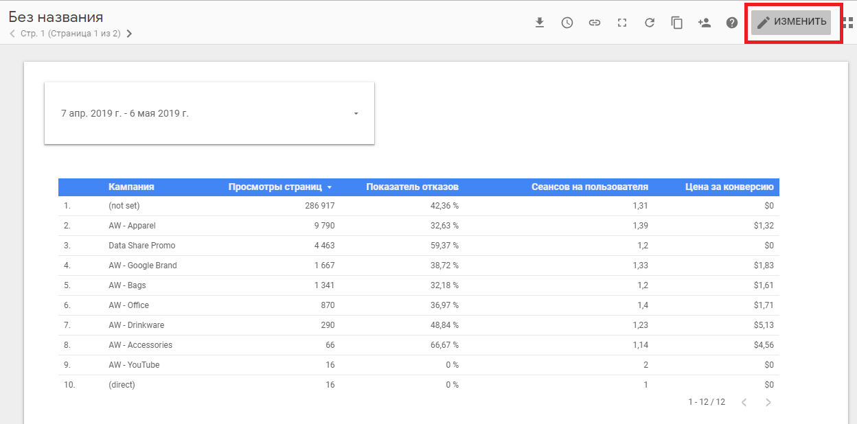 После построения отчета переходим на страницу просмотра (данные на ней редактировать невозможно). Чтобы вернуться к редактору нажмите «Изменить».