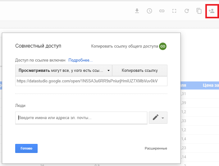 Если необходимо, поделитесь сделанным отчётом кликнув по отмеченной на скриншоте кнопке (как с Google таблицами или Документами).