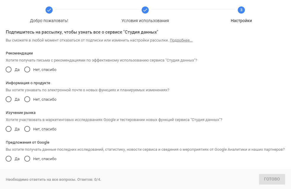 4. Отвечаем на появившиеся 4 вопроса, после чего кликаем по кнопке «Готово».